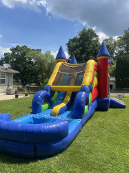 Enjoy this Dual water slide bounce house equipped with a Basketball hoop, pool and more!